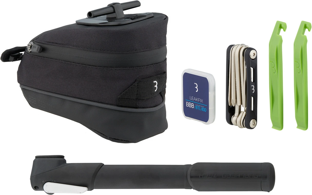 Lieferumfang:1 x Satteltasche BBB StorePack M BSB-12M1 x Minipumpe BBB WindWave BMP-541 x Multitool BBB MaxiFold S BTL-141S2 x Reifenheber BBB EasyLift BTL-811 x Reparaturset BBB LeakFix BTL-801 x Halterung für Minipumpe2 x Befestigungsschraube