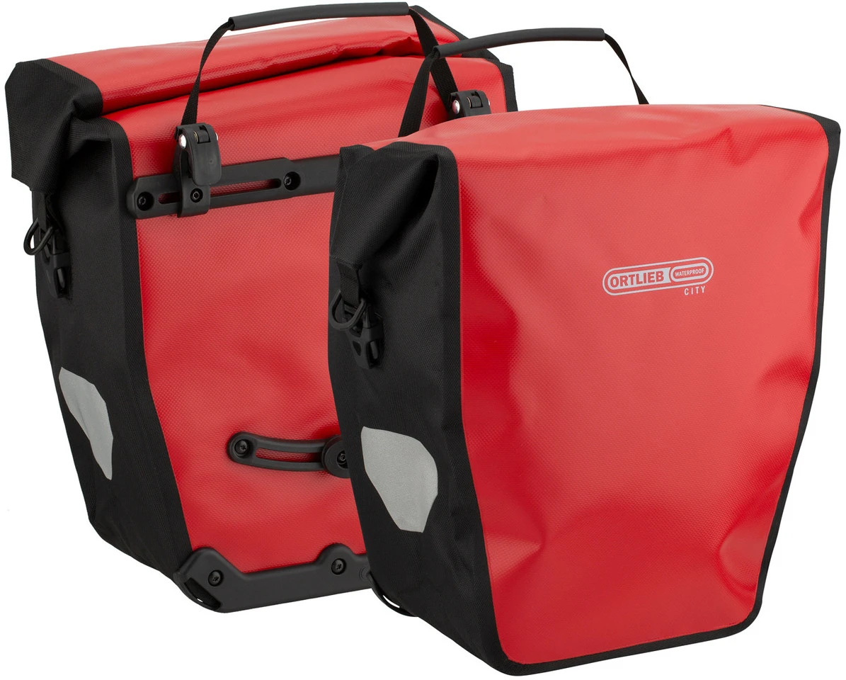 Die wasserdichten Back-Roller City von ORTLIEB sind die perfekten Begleiter für Biker, die in der Stadt zu Hause sind und nach alltagstauglichen Hinterradtaschen mit viel Stauraum suchen. Mit einem Fassungsvermögen von 20 Litern pro Tasche bieten sie Dir viel Platz für Einkäufe und Besorgungen, oder Du transportierst darin Deine Sportsachen für den Besuch im Fitnessstudio. Der Rollverschluss schützt dabei das Innenleben vor Nässe und Schmutz und kann mittels Steckschließen an der Seite fixiert werden. Mithilfe des Quick-Lock1-Halterungssystems befestigst Du sie ruckzuck einzeln oder paarweise an Deinem hinteren Gepäckträger. Die oberen QL-Haken und die unteren Schiebehaken sind mit einem Innensechskant der Größe 3 einstellbar. Da man in der Stadt selten der einzige Verkehrsteilnehmer ist, befinden sich auf den Taschenseiten leuchtstarke Reflektoren aus 3M™-Scotchlite™-Reflektormaterial zur Steigerung der Verkehrssicherheit.