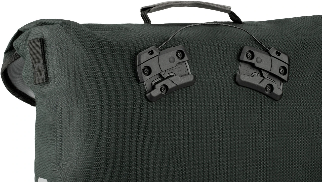 Das Quick-Lock3.1 Halterungssystem kommt insbesondere bei Büro- und Citytaschen zum Einsatz und zeichnet sich dadurch aus, dass ein Großteil der Halterungselemente am Gepäckträger befestigt wird. Am Rücken der Tasche befinden sich keine Haken, sondern flache Halteplatten, die im Alltag unauffällig sind und den Tragekomfort erhöhen. Mit nur einem Handgriff ist die Tasche befestigt und wieder abgenommen, indem man lediglich den Griff zur Ver- und Entriegelung anhebt. Das Montageset ist in Höhe und Neigung einstellbar und auch der untere Haken ist in 15-Grad-Schritten drehbar, sodass es an verschiedenste Gepäckträger passt und die Pedalierfreiheit gewährleistet bleibt. Die Halterungsschiene des Montagesets trägt auch Taschen mit QL1, QL2, QL2.1 und QL3-System. Ein weiterer Vorteil des QL3.1-Halterungssystems: Die Auflagefläche des Gepäckträgers bleibt frei, beispielsweise für einen Fahrradkorb.