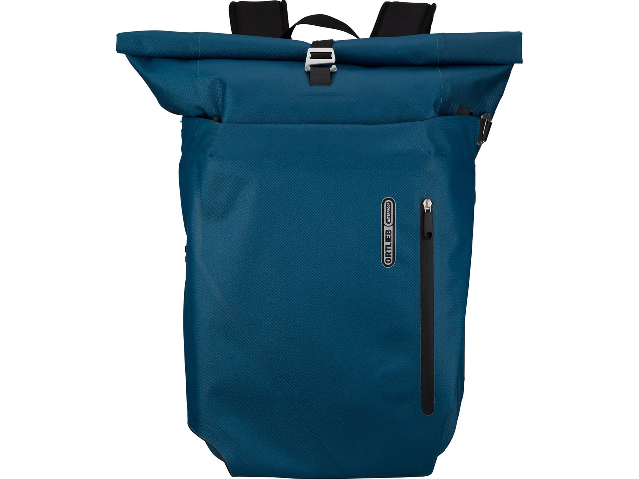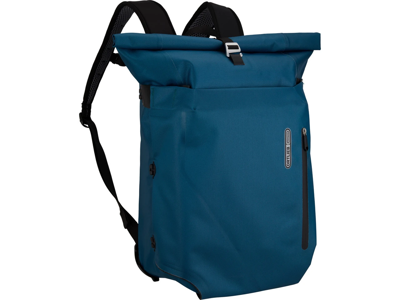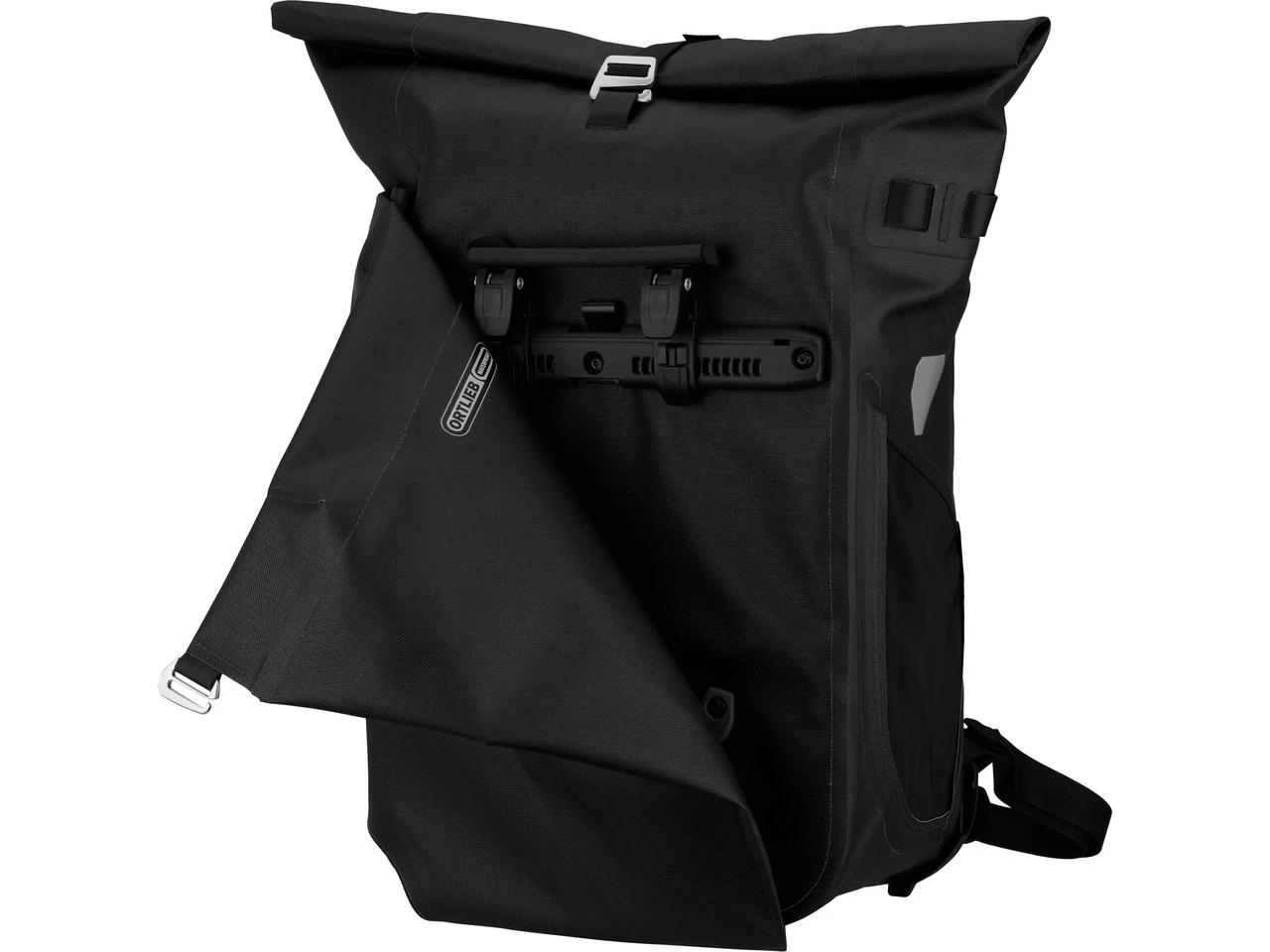 Dieser ORTLIEB Vario PS ist ein wasserdichter Rucksack, den Du mühelos in eine Fahrradtasche mit QL2.1-Halterungssystem umwandelst. Damit eignet er sich besonders für den täglichen Einsatz beim Pendeln im Stadtverkehr. Auf der einen Seite befinden sich die Rucksackträger, auf der anderen die Halterungselemente für die Anbringung am Fahrrad. Eine Flap bedeckt die jeweils nicht benötigte Seite und kann zum unkomplizierten Wechsel einfach auf die andere Seite umgeschlagen und an der Seite eingehakt werden. Sie weist zusätzlich eine kleine Reißverschlusstasche auf, die im Rucksack-Modus von außen zugänglich ist. Beim QL2.1-System befinden sich einstellbare Halterungshaken an der Tasche, welche sie an den Gepäckträgerstreben fixieren. Im Inneren des Vario PS nimmt ein eigenes Fach ein Notebook bis 15,4″ auf und bietet daneben genügend Platz für alles, was Du jeden Tag so benötigst. Der praktische Rollverschluss wird mit einem Verschlusshaken gesichert. An der Seite befindet sich eine Netztasche, beispielsweise für eine Trinkflasche. Auf beiden (schmalen) Seiten erhöhen außerdem Reflektoren Deine Sichtbarkeit im Dunkeln. Das Rucksacksystem ist dank ergonomischer Schulterträger und bequemer Rückenpolster mit Lüftungskanälen besonders komfortabel. Durchdachtes Detail: Die Einstellbänder der Schulterträger sind an diesen eingeschlauft, sodass keine losen Enden herausragen können.