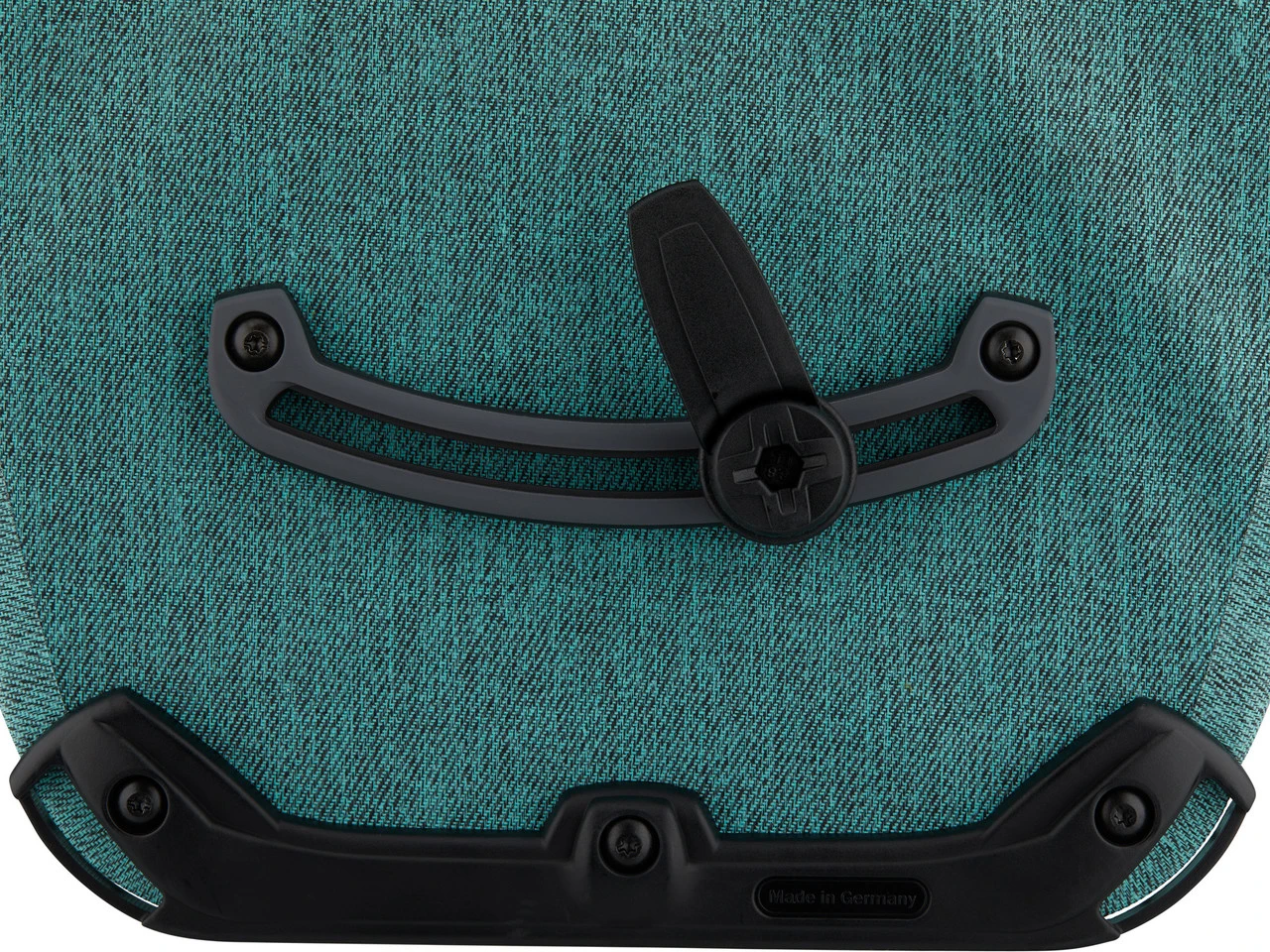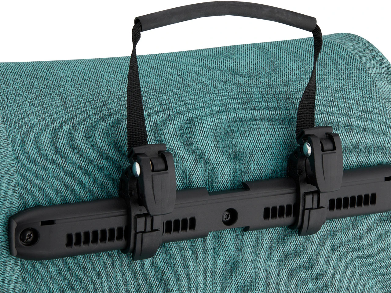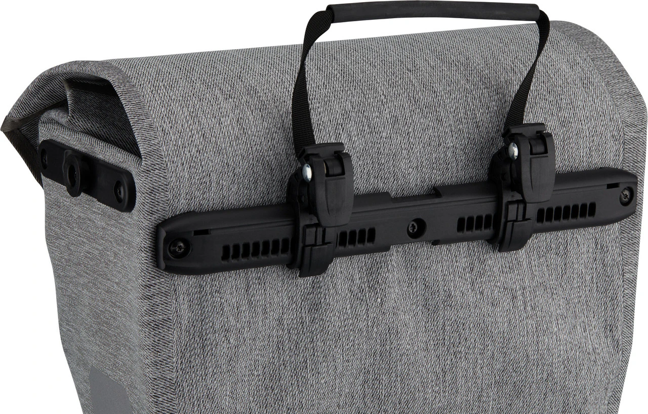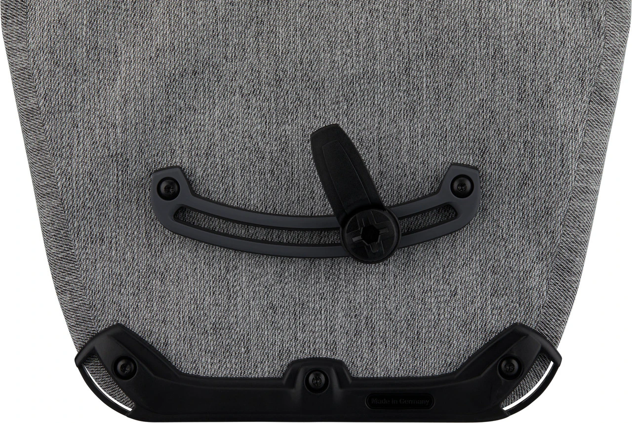 Das Quick-Lock2.1-Halterungssystem basiert auf dem bewährten Quick-Lock2-System, bietet jedoch einige Verbesserungen. Die obere Schiene, in der auch die optionale Diebstahlsicherung angebracht werden kann, ist einteilig ausgeführt, was ein Plus an Stabilität mit sich bringt. Auf der Innenseite kommen besonders flache Unterlegscheiben zum Einsatz, so wird der Tascheninhalt durch diese kaum beeinträchtigt. Der Taschengriff dient als Riegel: Hebst Du den Griff an, öffnen sich die Halterungshaken, lässt Du ihn los, schließen sie sich. Die Grundhaken sind für Rohrdurchmesser von 16 mm gedacht. Mit mitgelieferten Reduzierstücken oder optional erhältlichen Ersatzhaken lässt sich die Tasche jedoch auch an Rohren mit 8, 10, 12, 18 oder 20 mm Durchmesser klapperfrei anbringen. Die Reduzierstücke werden seitlich eingeschoben und bleiben so sicher an Ort und Stelle. Der Zwei-Komponenten-Kunststoff mit Anti-Scratch-Funktion, der für die untere Schiene in Form einer Halbellipse verwendet wird, sorgt für weiche Auflageflächen und reduziert die Reibung am Gepäckträger. Der untere Haken kann variabel angepasst und in 15-Grad-Schritten gedreht werden. Die Handhabung ist denkbar einfach: Für die Einstellung der Haken wird kein Werkzeug benötigt.