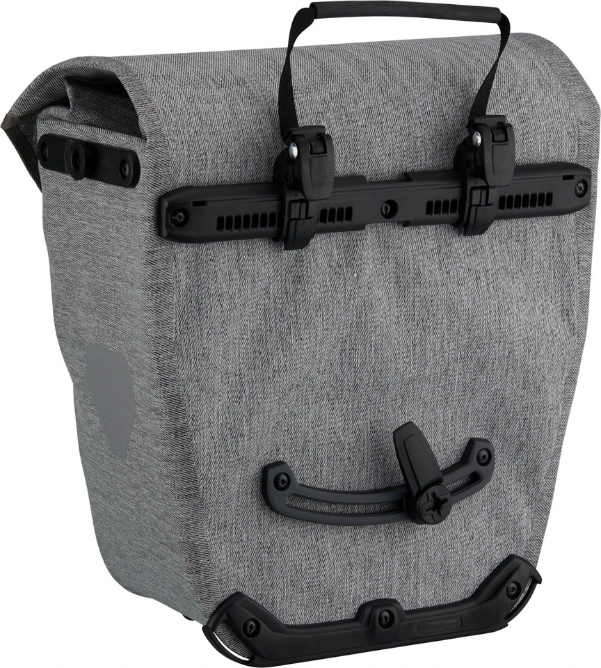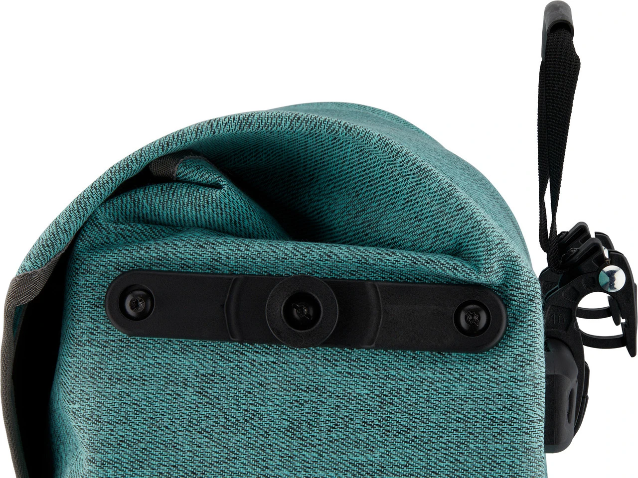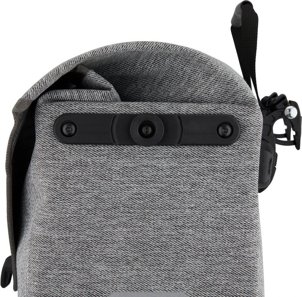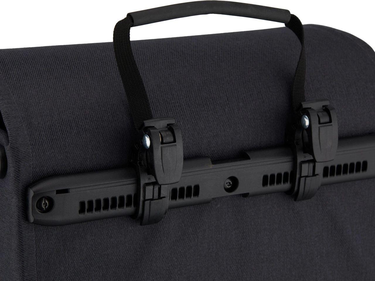 Das Quick-Lock2.1-Halterungssystem basiert auf dem bewährten Quick-Lock2-System, bietet jedoch einige Verbesserungen. Die obere Schiene, in der auch die optionale Diebstahlsicherung angebracht werden kann, ist einteilig ausgeführt, was ein Plus an Stabilität mit sich bringt. Auf der Innenseite kommen besonders flache Unterlegscheiben zum Einsatz, so wird der Tascheninhalt durch diese kaum beeinträchtigt. Der Taschengriff dient als Riegel: Hebst Du den Griff an, öffnen sich die Halterungshaken, lässt Du ihn los, schließen sie sich. Die Grundhaken sind für Rohrdurchmesser von 16 mm gedacht. Mit mitgelieferten Reduzierstücken oder optional erhältlichen Ersatzhaken lässt sich die Tasche jedoch auch an Rohren mit 8, 10, 12, 18 oder 20 mm Durchmesser klapperfrei anbringen. Die Reduzierstücke werden seitlich eingeschoben und bleiben so sicher an Ort und Stelle. Der Zwei-Komponenten-Kunststoff mit Anti-Scratch-Funktion, der für die untere Schiene in Form einer Halbellipse verwendet wird, sorgt für weiche Auflageflächen und reduziert die Reibung am Gepäckträger. Der untere Haken kann variabel angepasst und in 15-Grad-Schritten gedreht werden. Die Handhabung ist denkbar einfach: Für die Einstellung der Haken wird kein Werkzeug benötigt.