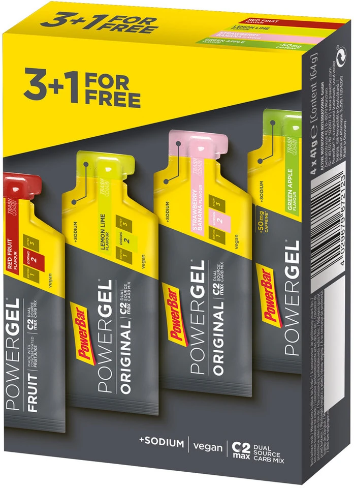 Natrium:500 mg / 205 mgKoffein:122 g / 50 mgLieferumfang:1 x Multipack PowerBar PowerGel 3+1, Nettofüllmenge 164 g