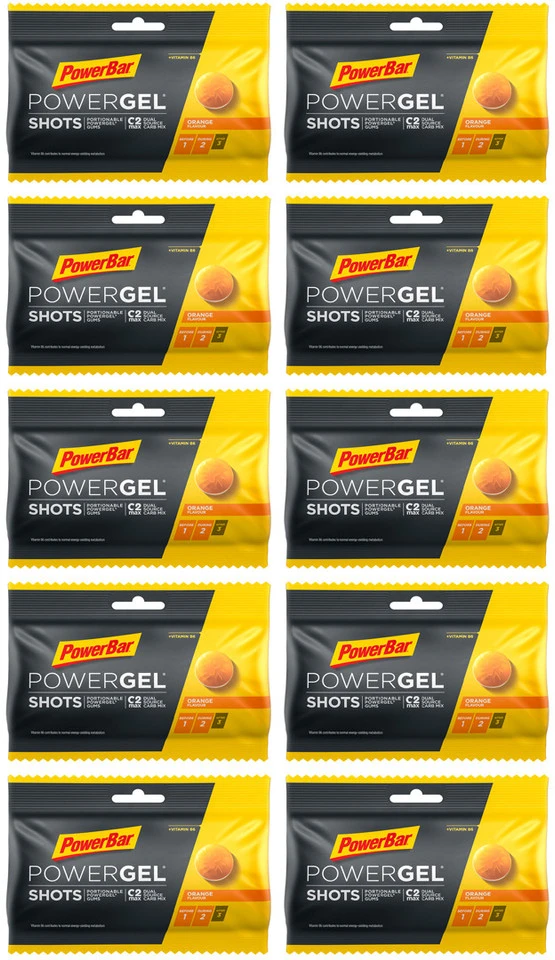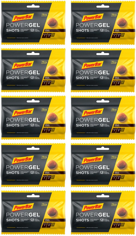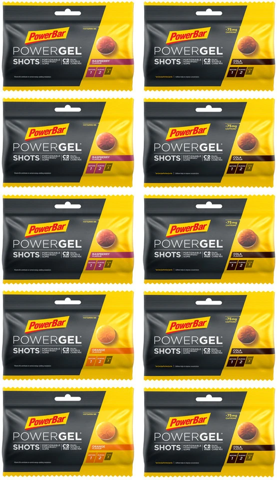 5 x Beutel PowerBar PowerGel Shots Fruchtgummis, Nettofüllmenge 300 g, cola – caffeine2 x Beutel PowerBar PowerGel Shots Fruchtgummis, Nettofüllmenge 120 g, orange3 x Beutel PowerBar PowerGel Shots Fruchtgummis, Nettofüllmenge 180 g, raspberry