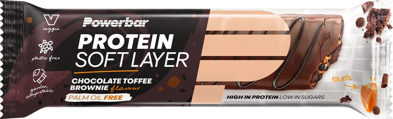 Die Protein Soft Layer Proteinriegel von PowerBar versorgen Dich mit einer gehörigen Portion Eiweiß. Die Riegel haben drei von Schokolade umhüllte Schichten: eine weiche Proteinschicht, eine Schicht mit Karamellgeschmack und eine knusprige Schicht mit Crispies. Die Riegel enthalten kein Palmöl und Kollagen. Außerdem sind sie in einer kompostierbaren Folie verpackt.