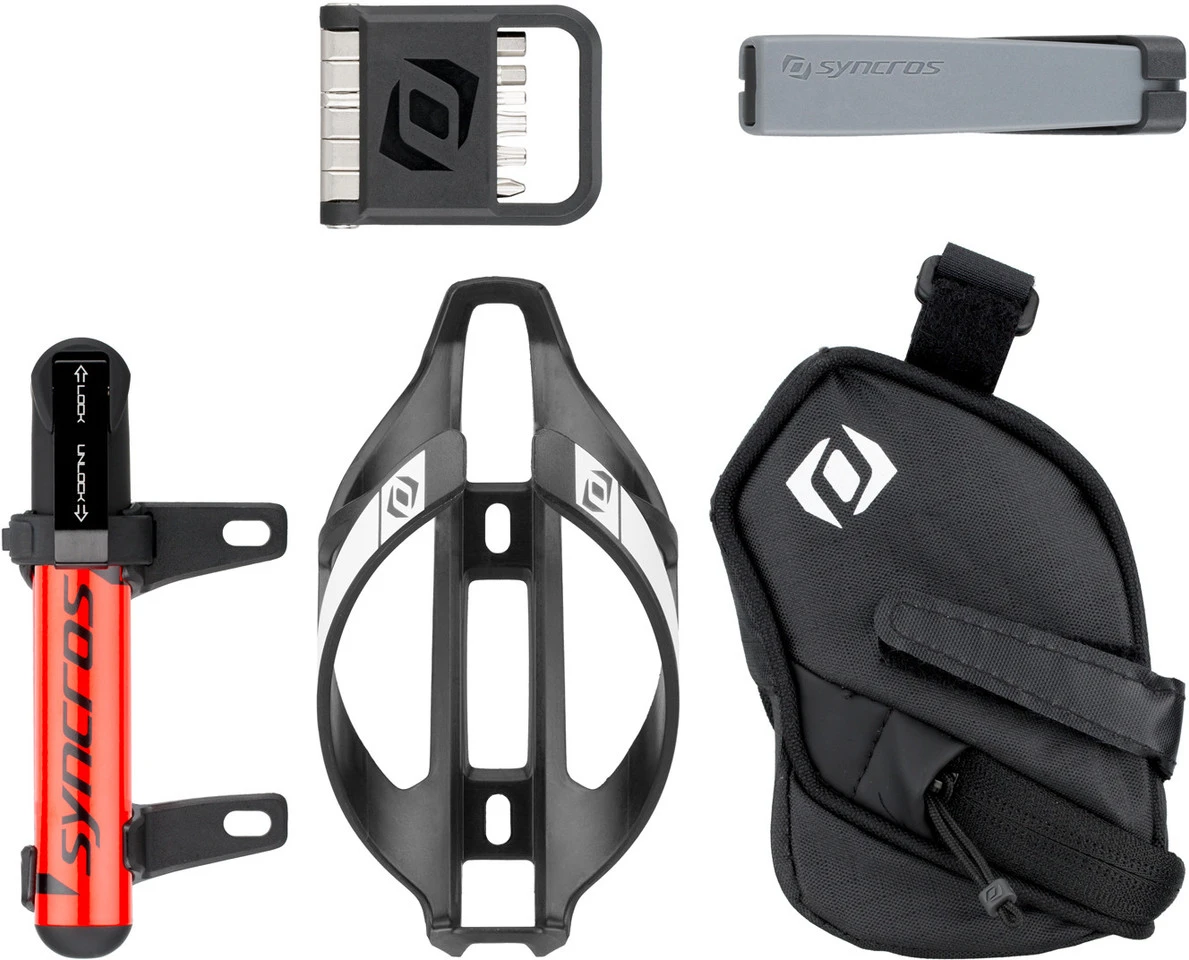 Lieferumfang:1 x Satteltasche Syncros2 x Reifenheber Syncros1 x Minipumpe Syncros HP1 x Multitool Syncros Matchbox 61 x Flaschenhalter Syncros
