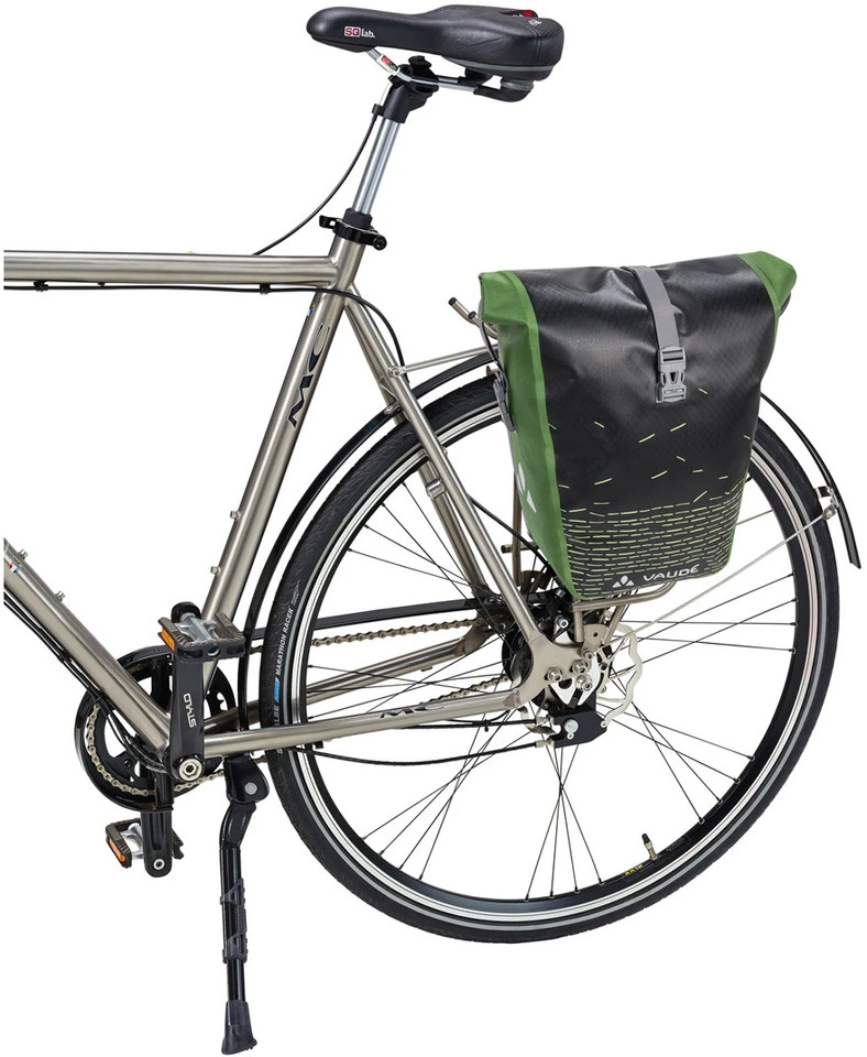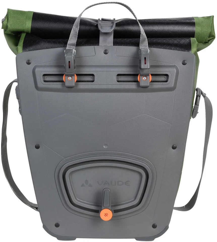 Die wasserdichte Hinterradtasche mit dezentem Printaufdruck wird aus robustem, PVC-freiem Planen-Material klimaneutral am deutschen VAUDE-Standort in der Nähe des Bodensees hergestellt. Sie lässt sich durch den Wickelverschluss auf individuelle Größen bringen und absolut dicht verschließen. Für Übersichtlichkeit sorgt eine einfache Innentasche. Die Radtasche wird mit dem QMR 2.0-System und stabiler Rückenplatte rechts oder links am hinteren Gepäckträger befestigt, ist einfach über ein Handrädchen justierbar und lässt sich schnell und einfach abnehmen. Mit einem Fahrradschloss kann sie direkt am QMR-Haken verriegelt werden. Reflexelemente sorgen für eine gute Sichtbarkeit im Straßenverkehr.